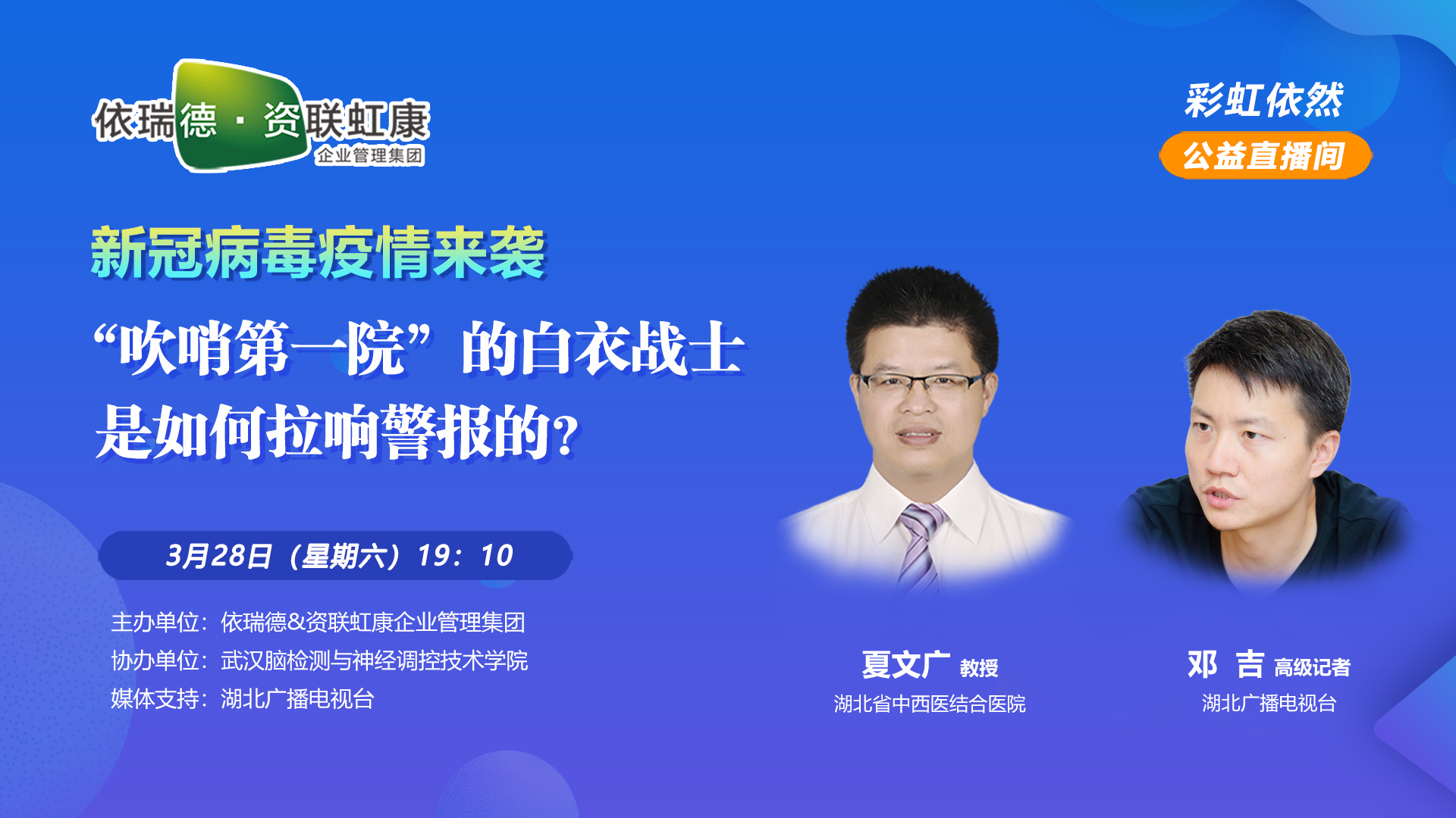 3月28日晚上,湖北省中西医结合医院夏文广副院长在“彩虹依然公益直播间”用在线直播的方式,向广大网友介绍了“新冠肺炎疫情警报是如何拉响的”。 查看详情